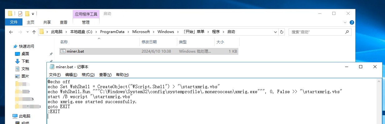里面有一些Sys、exe文件,还有一个bat文件,编辑它,发现还会生成一个startxmrig.vbs的文件。