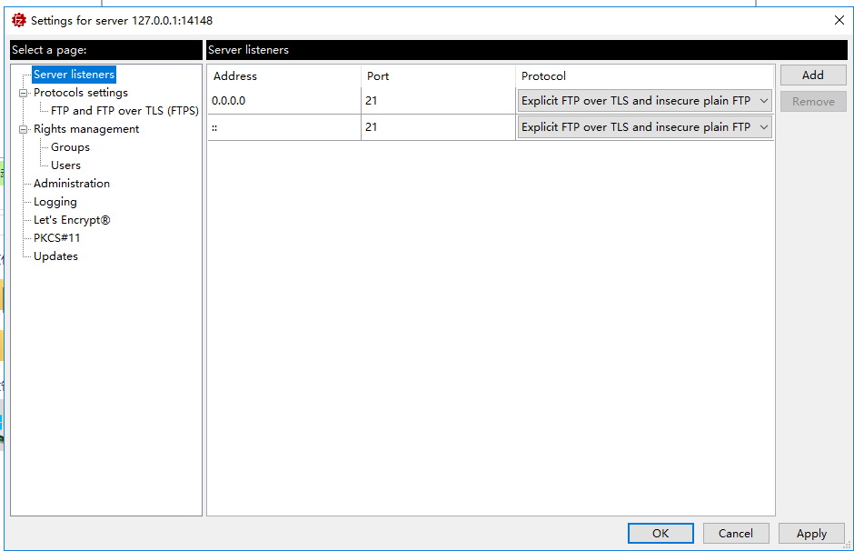 FileZilla Server配置心得 2025年8月28日 作者 Jason 请确保软件版本是最新的,包括客户端、服务器端。 配置后,服务需要重新启动。 在阿里云控制台配置组策略,端口范围可以使用“100/200”表示范围。 建议使用第二种“显式FTP/TLS或者不安全的普通FTP”,而最后一种隐式FTP也过时了。 记得在系统防火墙设置相应端口规则。 参考:使用新版 FileZilla Server 快速架设你的 FTP 服务端-CSDN博客